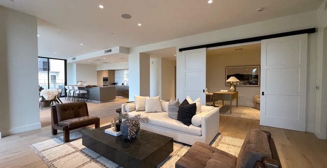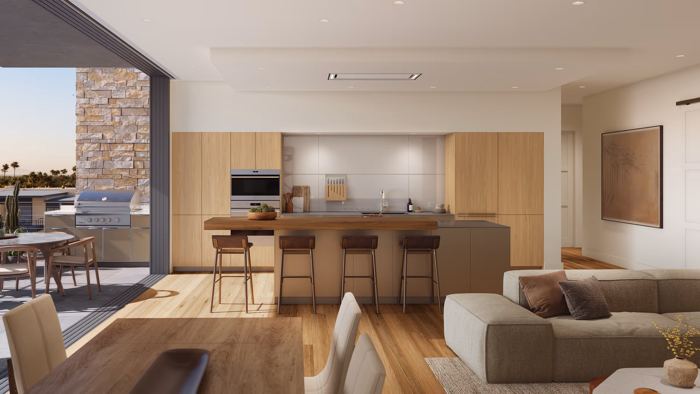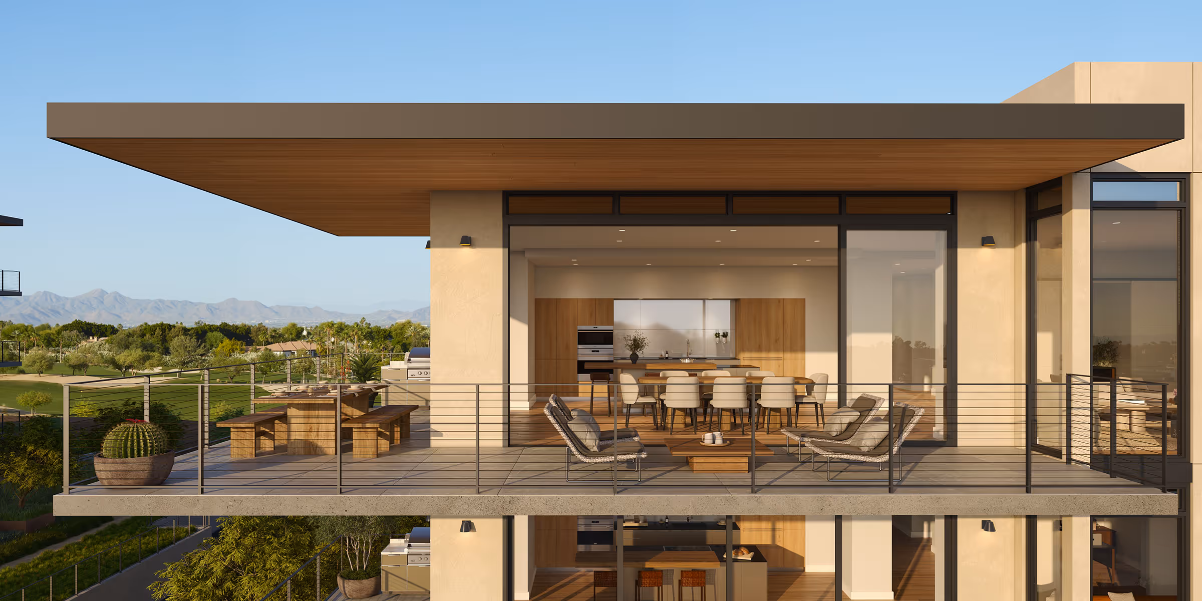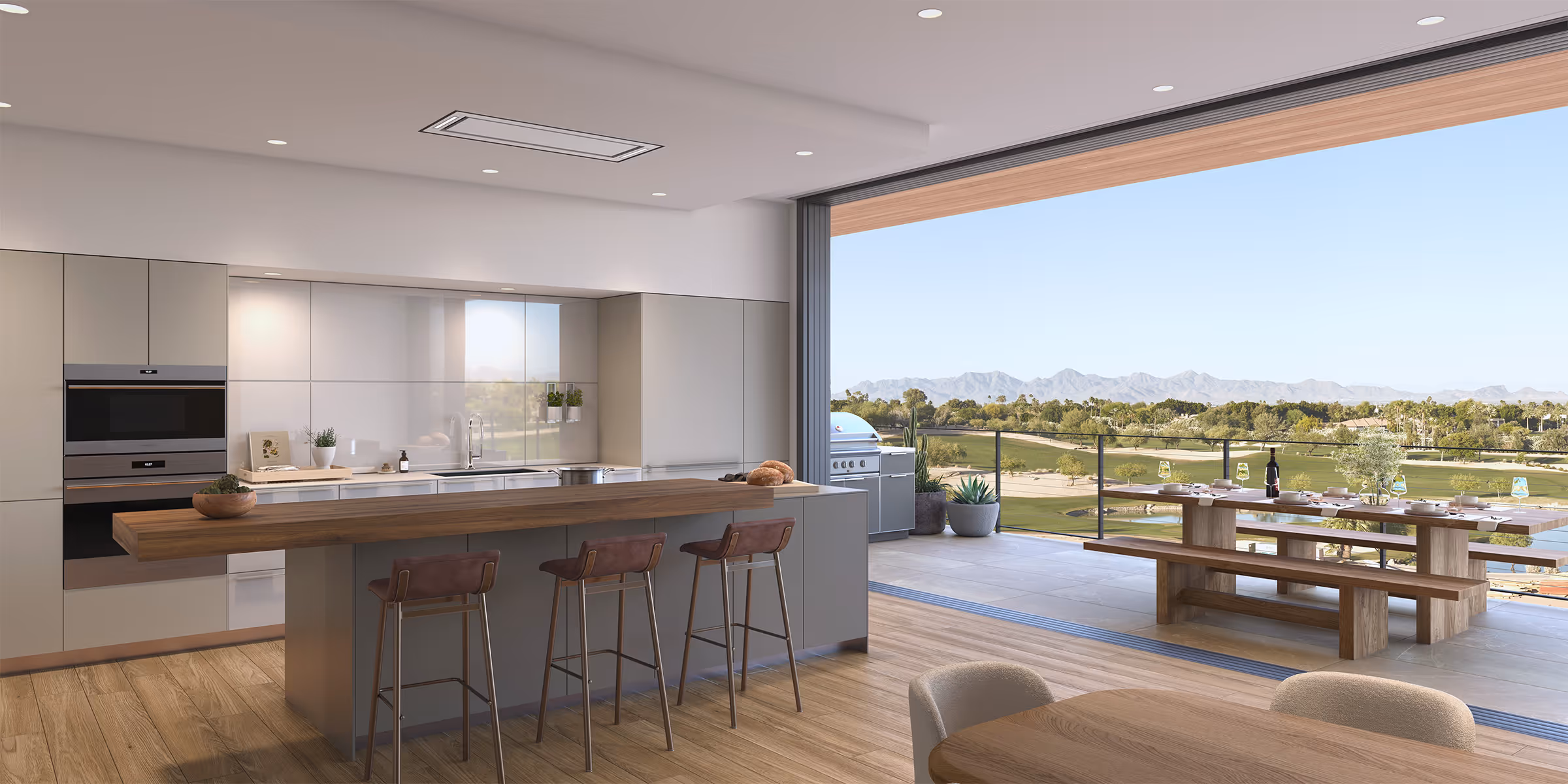 Open-concept living rooms flow with ease into dining, kitchen, and outdoor living areas. Interior aesthetics by Vallone Design, featuring a choice of two palettes that integrate natural materials, with clean lines and colors that blend into the Sonoran Desert landscape.