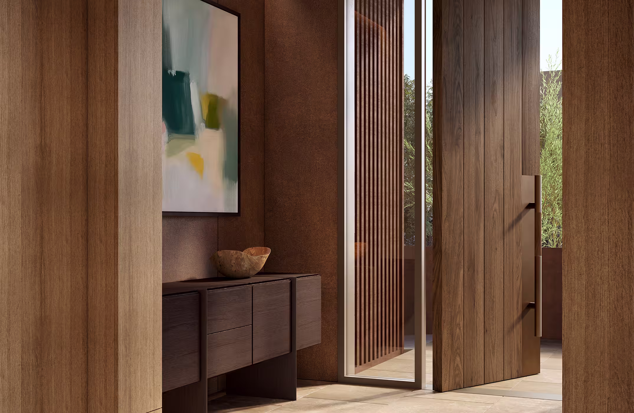 The residential lobby is intimate and warm, with red sandstone, weathered metal, and a custom 10-foot wood, pivot door with Tom Kundig Collection hardware. Interiors feature tactile materials that bring the outside in, with relaxed seating and artwork commissioned by local artists.