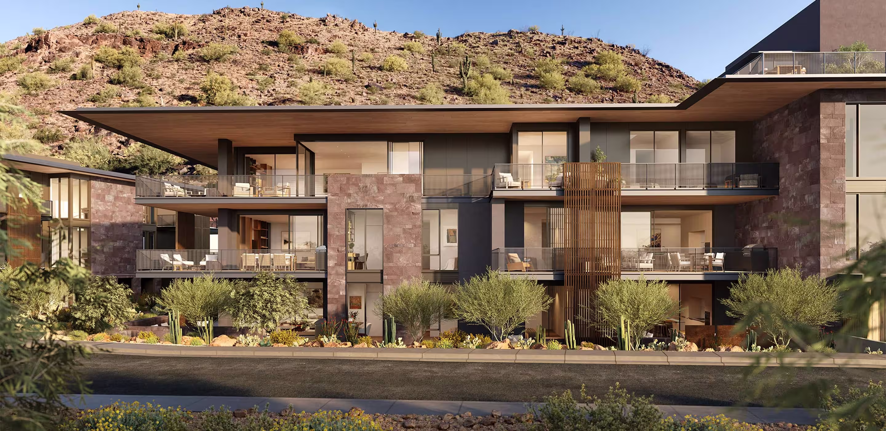 The 63 exclusive residences rise naturally from the contours of Camelback Mountain, with materials that echo the rich tones and textures of the surrounding desert landscape. Deep cantilevered rooflines, shaped to harmonize with the movement of the sun, create shaded outdoor spaces that seamlessly blend indoor and outdoor living. Textured facades of weathered metal and stone add depth and refinement, enhancing the timeless connection to place.